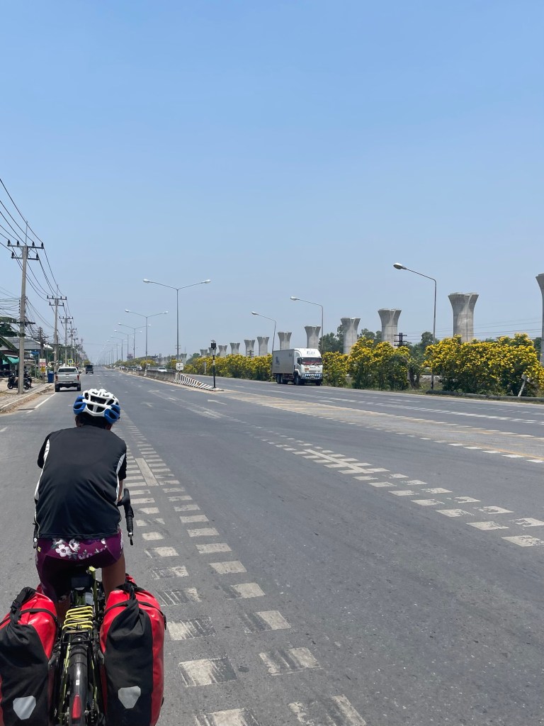 We finally left the canal and joined the 3309. We passed yet another 7-eleven. It must have been our 20th. The temperature in Bang Pa In was at least 36°C and it felt more like 38°C. These were unimaginable temperatures for us to cycle in just a few weeks prior. We couldn’t see the river, but we were next to it. There was occasionally a cold breeze. The only sightseeing was of the insane railway structure. They were building it all up on plinths, just behind the existing railway, using specialist equipment.