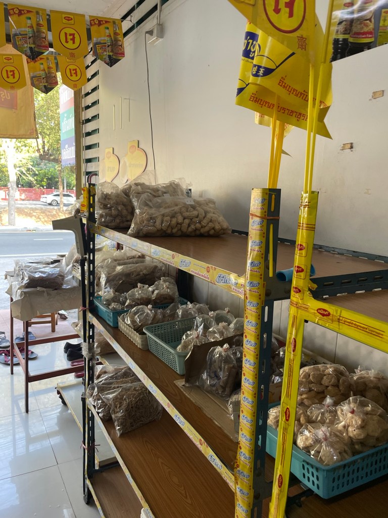Still, we went to find fruit and hopefully nuts. At the second supermarket we went to an older Thai woman, who spoke perfect English, told us we could find the Ong Gaan Tolasap night market a stones throw away. The stalls were position closely to each other, creating a narrow walkway. Artificially narrow, but the experience was successfully created. Frankie found it annoying her belly wasn’t happy with all the tasty food teasing her.