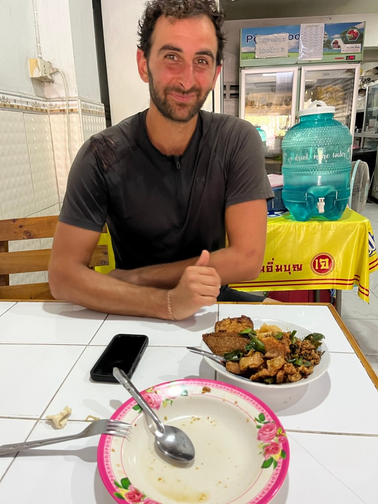 We primarily bought fruit. Bananas, marien plum, cashews, papaya. Also a box of cooked tofu which came with dipping sauce and peanuts. We arrived back to the hotel with bottles of cold water. It was now the proprietor, a perpetually half naked Thai man, told us he had hot and cold water on demand inside. We organised our breakfast for 7am. He seemed optimistic we would have some kind of vegan protein.