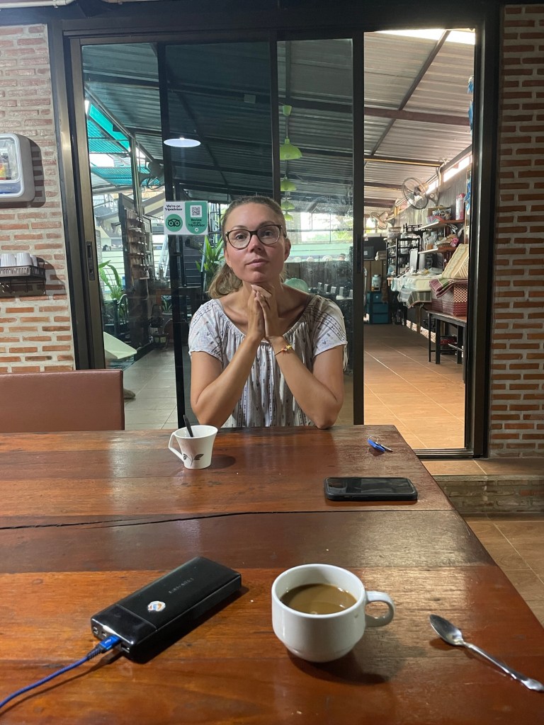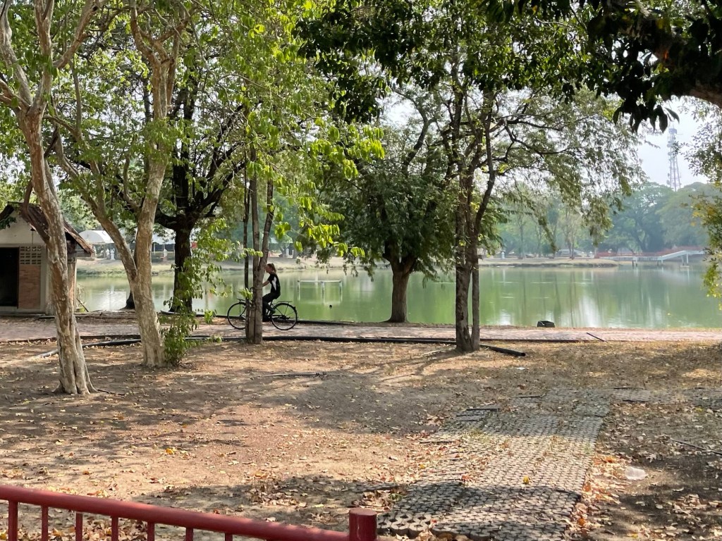 We treated ourselves to two intensely sweet sodas, tied them to Frankie’s basket, and cycled to Srinagarindra Park. They were so packed with ice it was good to let them melt a bit first. The park, dissected by waterways, should have been amazing. It was dotted with old temples. There were so many temples, that we hadn’t a snowballs chance in hell of seeing them all. All the bridges were dilapidated and the path overgrown though. We dared to cross two bridges, and sat, shielded from the Sun, in a covered seating area.