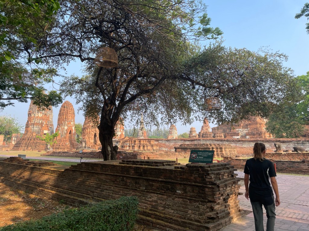 We could however, cycle them through the bumpily paved park, letting them drop down the big kerbs. Wat Phra Ram was deserted. We paid the standard 50 baht entrance fee and walked around the huge prang. Around the outside were the roofless cloisters. We could only imagine their glory, based on what we’d see at the grand palace.