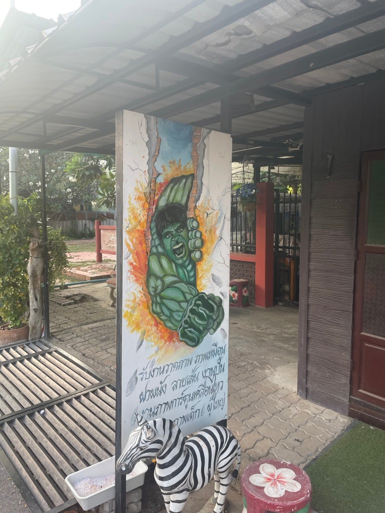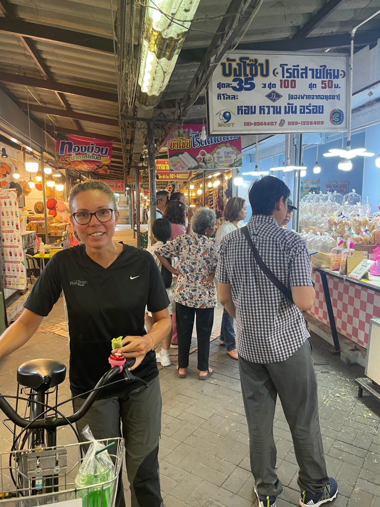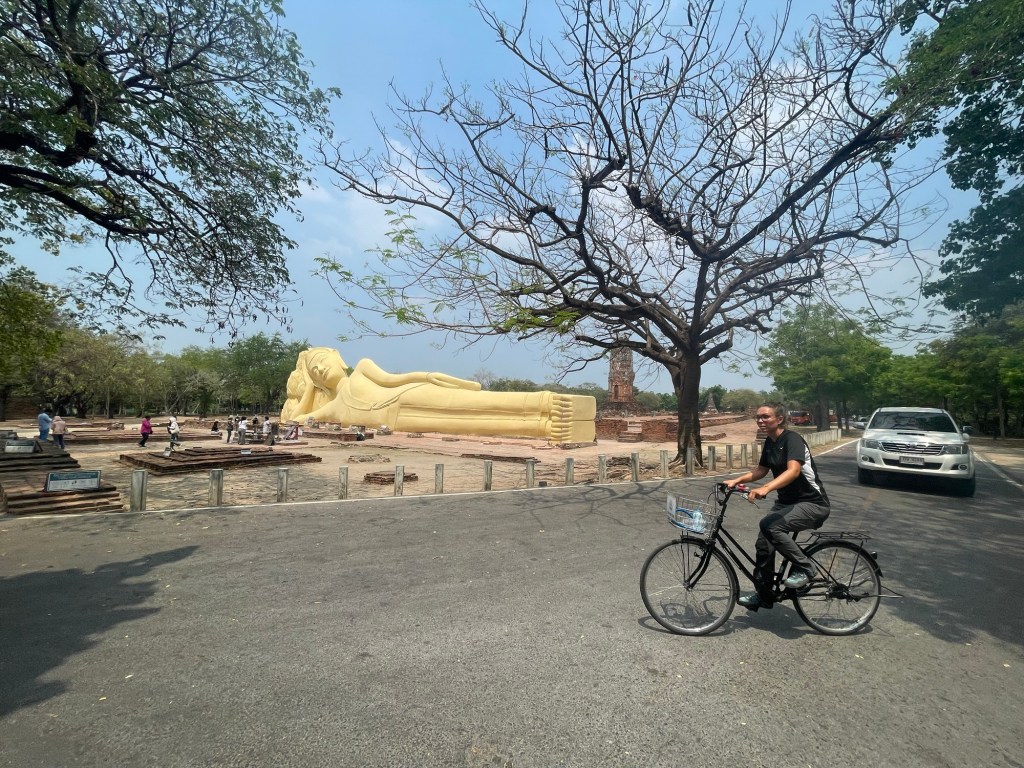 Back on the other side of town was another vegan restaurant. We headed there after cycling round the huge reclining Buddha at Wat Lokaya Sutha. The roads were busy and hot. And the restaurant was closed. A four day break. We just went back to the hotel. We didn’t want to have the same food again from Ranahat Je. We bought a watermelon, and some sweet potato from the 7-eleven instead.