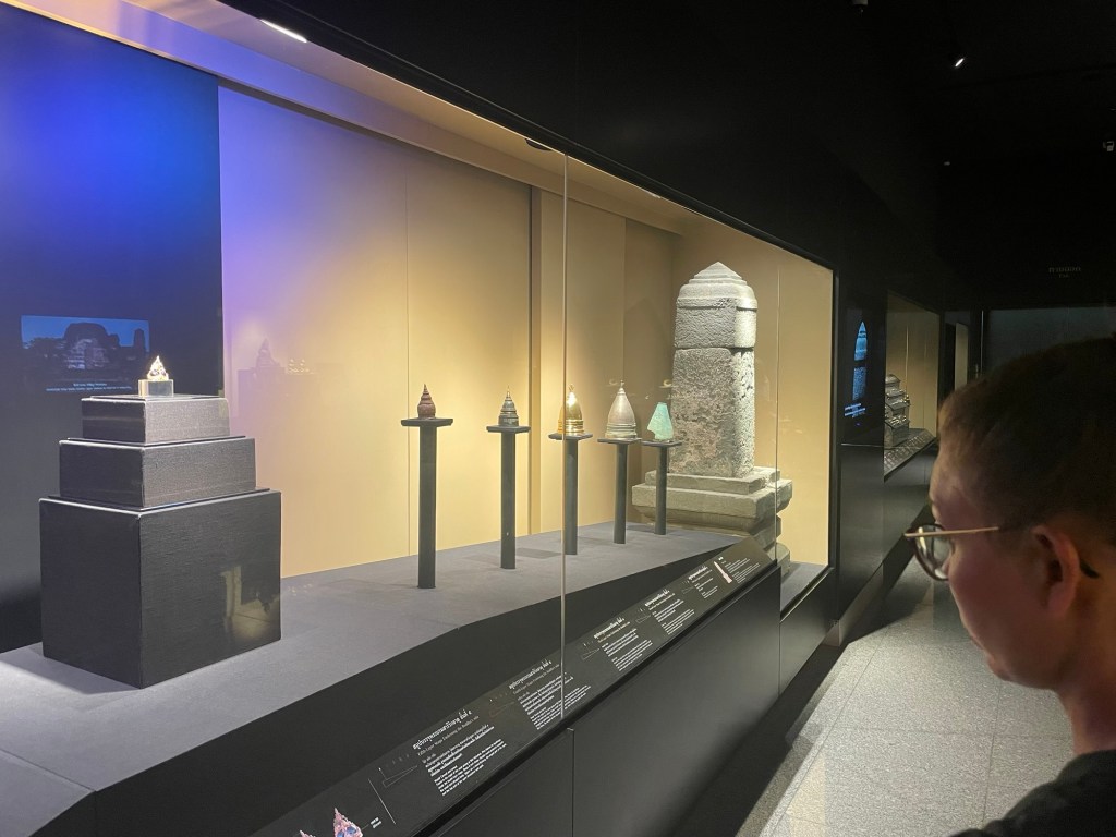 A renowned ornamental sword called Phra Sang Khan Chai Sri, that was almost stolen, had delicate designs of Persian flowers inscribed on its handle. The rest of the ‘zones’ of the museum exhibited artefacts, where possible, from the other temple sites. Stupas were like the Russian dolls of temple relics. Multiple layers of increasing ornateness. The votive tablets that were retrieved from the temples were sold to pay for the museum. These were like little squares of gold or silver, usually embossed with the Buddha in various poses.