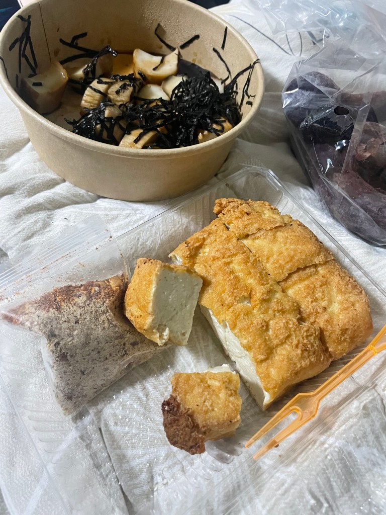 Just as the Sun started going down we took the bikes back and then headed to the market for our dinner. We bought a veritable feast at the market. There was actually a lot to choose from. Randomly, just as we were getting some tofu, we heard the national anthem playing loudly. Everyone froze for around 20 seconds. Well everyone but the woman slicing our tofu! There wasn’t much more to our day. We headed back to the hotel to eat and sleep.
