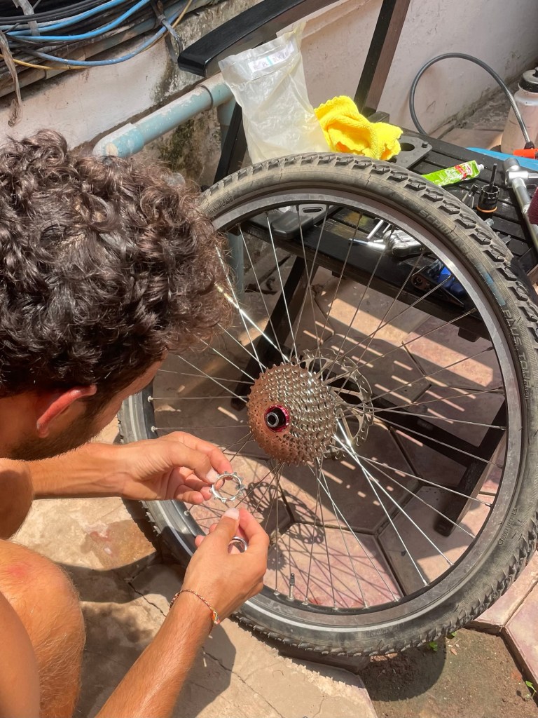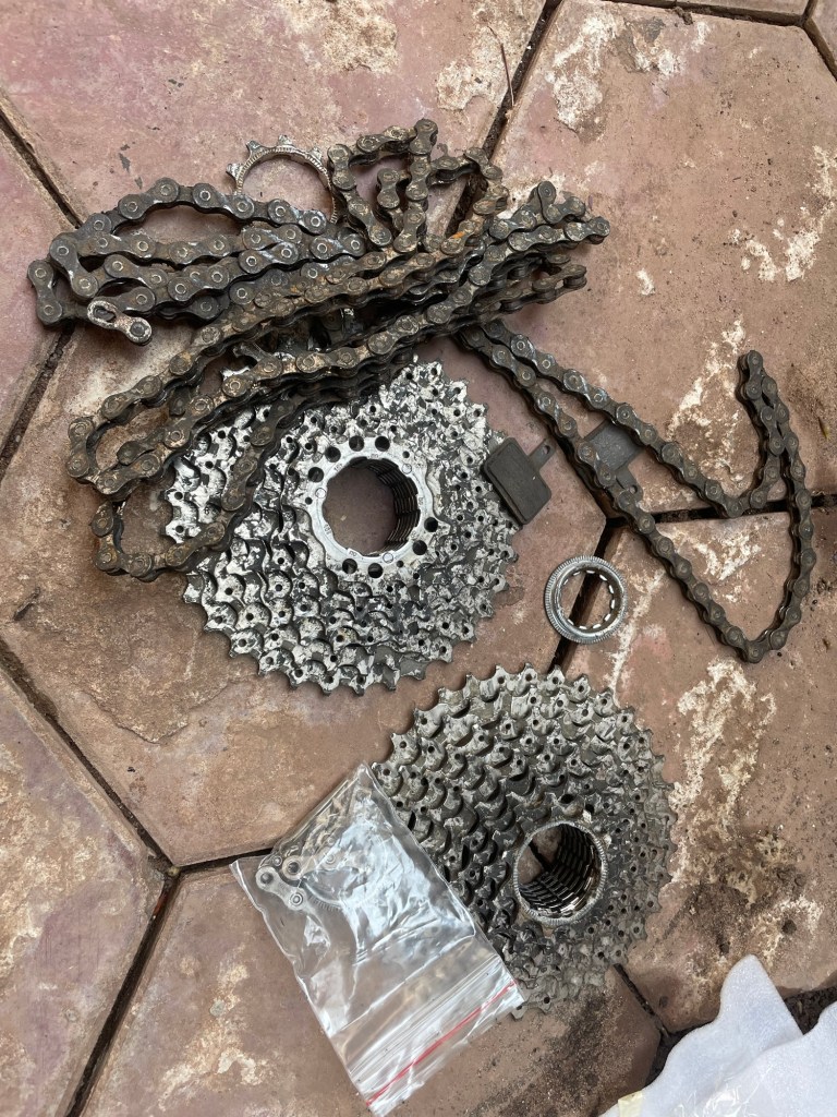The black Surly had fresh rear brake pads. Jonathan hasn’t had a rear brake since Turkey. The front brake has far greater stopping force anyhow. It was all straightforward enough but there was a lot of cleaning involved. Putting the cassettes back on required finesse. The green Surly needed to be tight against the bite plate to avoid the dreaded creaking returning. The black needed the cassette to be wiggled around to get it past the knobbly spindle.