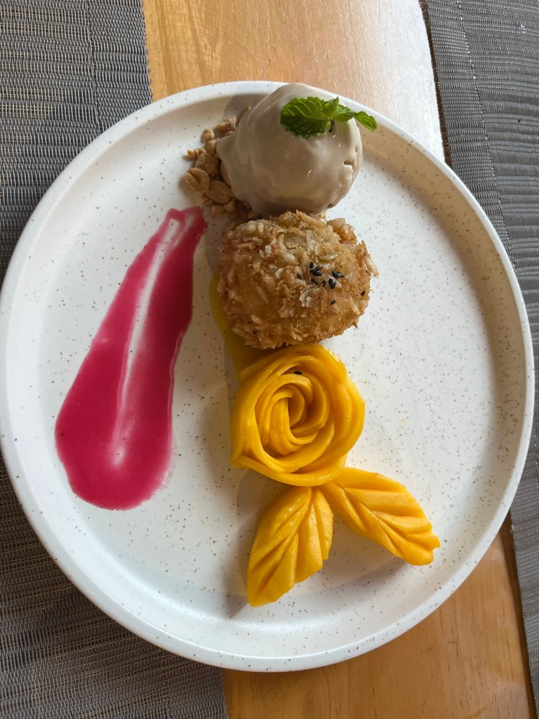 We ordered an ambok burger. Ambok is a traditional food, flattened rice. We think we’ve seen it drying in villages, on sheets of plastic, on our travels. It’s a more valuable ingredient. We also had teriyaki tofu and normal brown rice. An attempt to be healthy but it was also delicious. For dessert we had an ambok ball, which contained banana, with kaffir leaf ice cream. Scrumptious. The bill was $15, credit card accepted without a fee. We’d almost ordered in because you could get a discount. It was a pleasant evening of conversation that was worth a couple of dollars and less plastic.