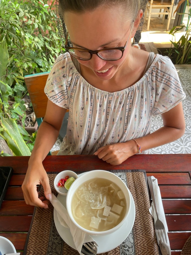 Jonathan didn’t sleep as well as he’d liked. Frankie never has any problems. We had breakfast at 9:30am. We decided to try a traditional Cambodian dish called congee. It’s a rice porridge dish, usually with meat, but we had it with tofu. It was quite bland. Not much colour. Our ‘big’ vegan breakfast still wasn’t very big.