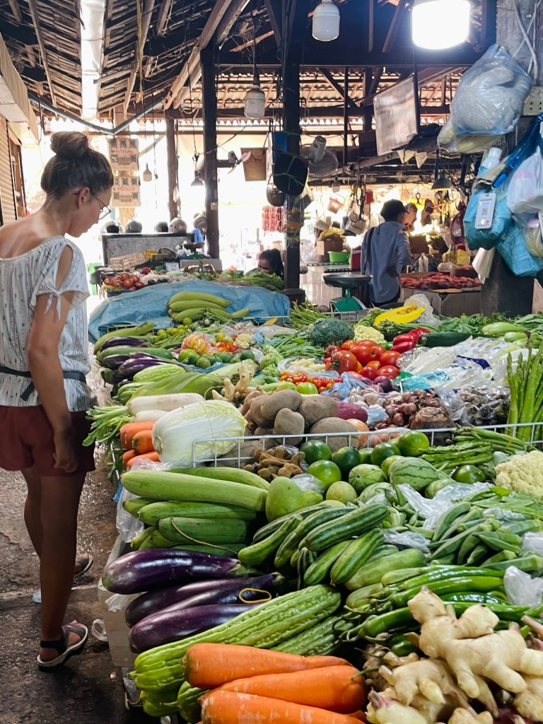 We walked back to the hotel via the ‘Old Market’. The outside of the market was all clothes and art stores. Once we’d penetrated, we found the food stalls. It took a while to find the vegetables. We were going to make dinner at home so we could ingest more vegetables. We walked round a few times. One woman was selling what we perceived as the best quality.