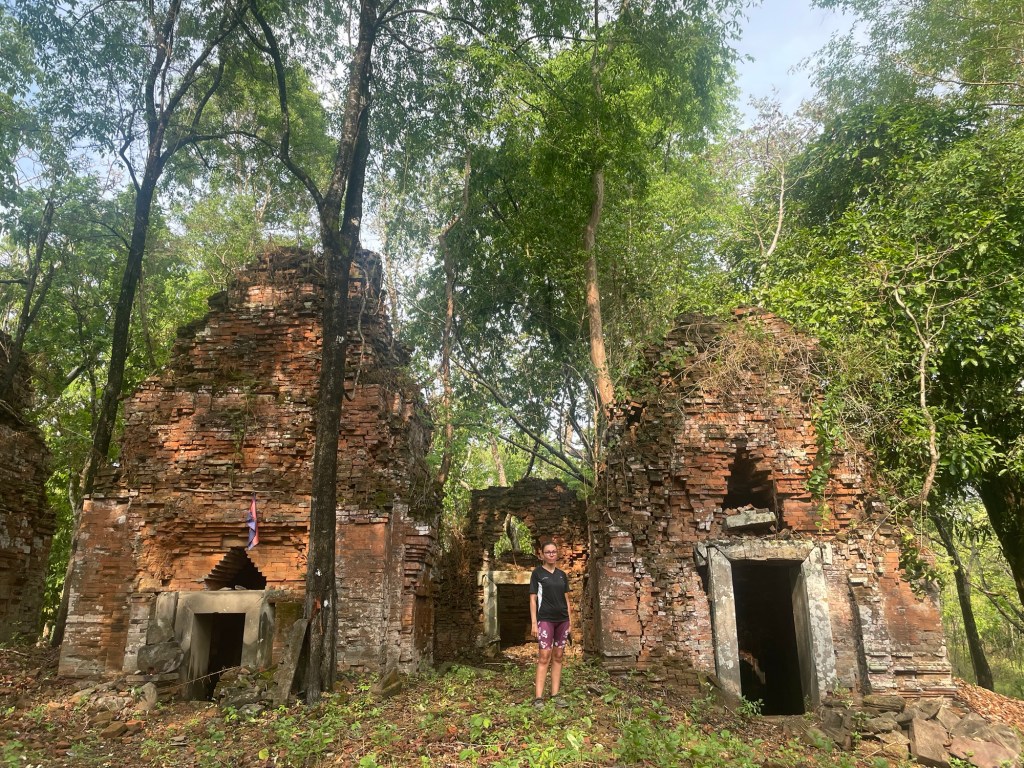 Scott had given us temple tips for our ride. They were littered all over the place. The temple we chose to visit wasn’t actually one he’d recommended. But one we thought was accessible for us. There was a kilometre of gravel track. The rain had made it sticky. We walked the last part into the woods. there was a nice temple when we arrived. Someone had just left and their incense was still burning. A full can of drink had just been opened. The set of six towers were close to each other. We could make out inscriptions on the stone door jambs.