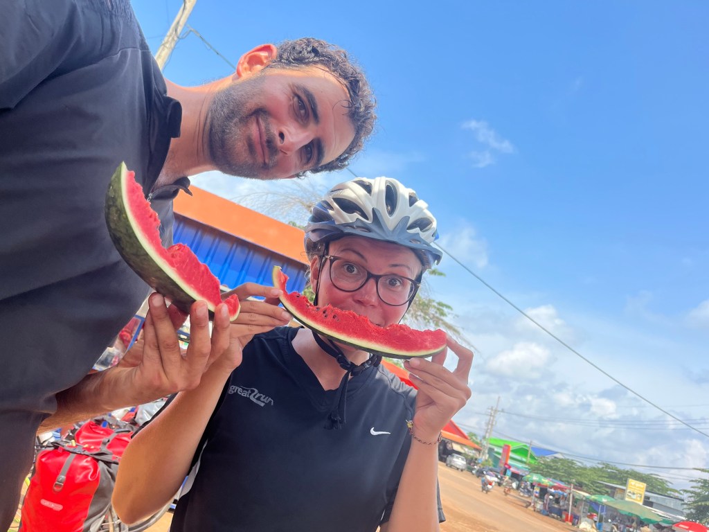 Two boys slowed down on their scooter and wished us a happy New Year. We tried to reply in Khmer. Semi-successfully. As we passed through a checkpoint, the army uniform clad officer beckoned for us to slow down. Then he promptly sprayed us with a giant water gun! We relished the cooling down.