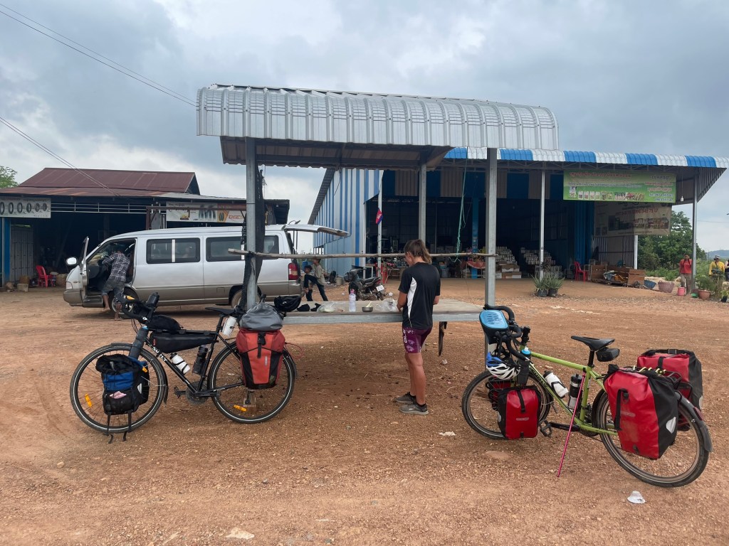 At the halfway point, we stopped where there was a shelter outside a garage. We sliced up one of the green mangoes that we’d gained from the owner of the accommodation the night before. We prepared some soy sauce and sugar. Then a small boy came over with a bag of red chilli, salt and sugar. It might have had fish paste in but we couldn’t refuse. He came back with some water two minutes later. Then a woman came over with yet more mango. Slightly riper than the one we had. We were very grateful. People with so little always share what they do have.