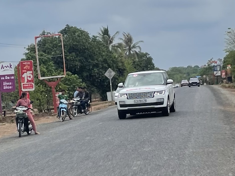We were going full steam ahead. It was incredibly cool weather. Sure it was 30C but there was no Sun and the skies were cloudy. A motorcade came smashing through. Hazards on. Cambodian, Thai and Laos flags printed on their bonnets. Everyone pulled over deferentially.