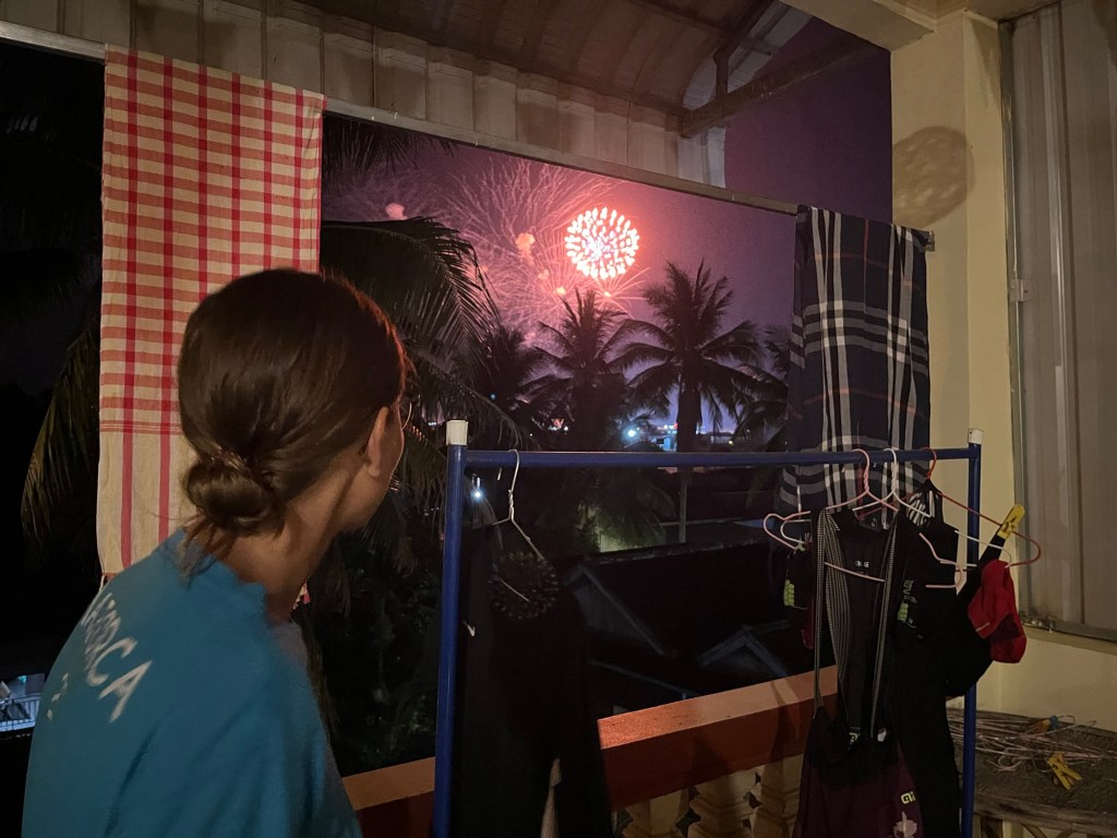 We’d chosen Savet Guesthouse. Solely on account of the review that said there was secure bicycle parking. It was a covered alleyway with a gate. Likely better than the previous night. The staff were young, and therefore grumpy. Our room was on the top floor. Four steep flights of stairs. Our legs wailed. The air conditioning was strong. We could hear the bass from music nearby.