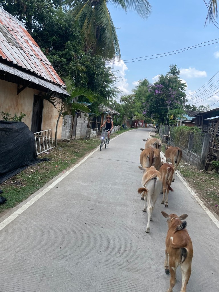 In the evening we went to find some dinner. The first two places we went to were shut. The third made us a papaya salad and some fried curried vegetables with rice. It was dark when we cycled back. Only Frankie’s bike had a dynamo driven light. We ate some mango, dragonfruit, bananas and peanuts. Watched some Black Mirror and Shield. Tomorrow we were off again. We wouldn’t be lingering on this island.