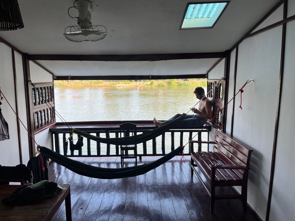 We followed the sandy path north. Passing restaurants selling ‘happy’ food. It’s got mushrooms and/or marijuana in it. Drugs are illegal in Laos but it doesn’t matter here. We found ourselves back at the bridge and then in our hotel soon enough. We relaxed in the cool for a couple of hours.