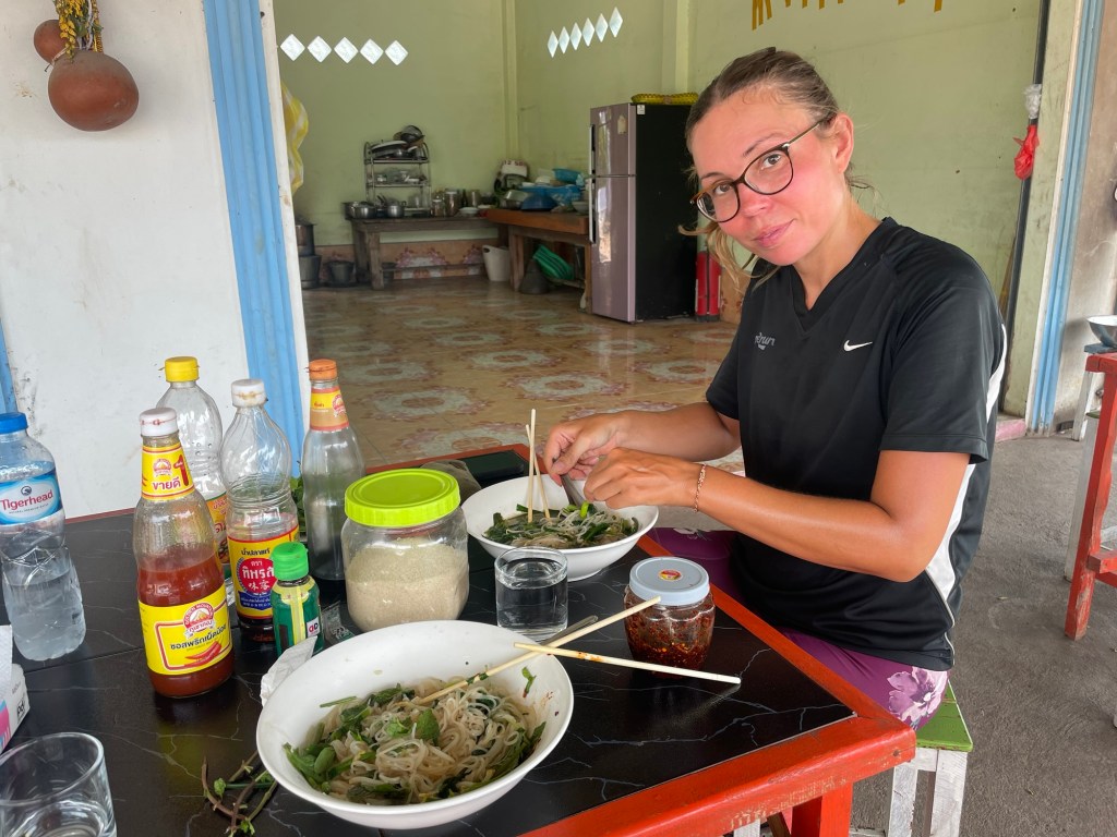 There were a few guesthouses in the area. We were keen to get at least 70k for the day so picked Ying Luck, the last one. Also with the best reviews. We stopped 4 times in the last 8km. First we stopped at a restaurant. We were only after rice. The only person eating there, a man, piped up and asked using in English what we were after. It was noodles only. We took our opportunity. He seemed to understand our request but the first bowl still came out full of meat. Even a native couldn’t get vegan food!Another try and we had just noodles and leaves with beansprouts.