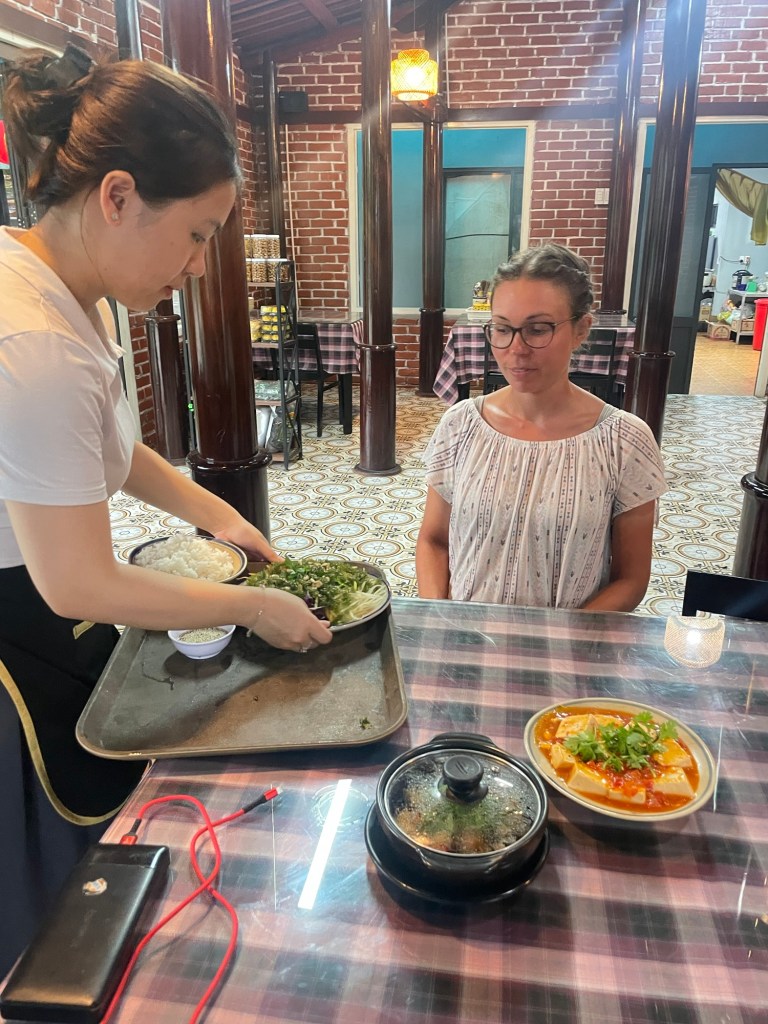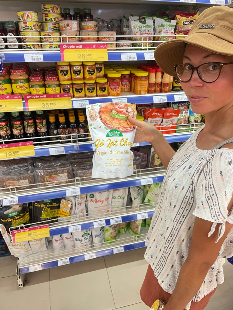 We carried on down the road to the Co.op supermarket. It was a little pricey but we gathered some nuts and seeds. The chay section was awesome. More types of soya products than we have at home. We bought some small tins of soya based protein. We revisited the market and bought dragonfruit. More bananas too, less ripe this time. We’d spotted some teal electric taxis driving around. Now we had a Vietnamese number we could sign up and order them instead. Same price but all electric. We took one back to the hotel.