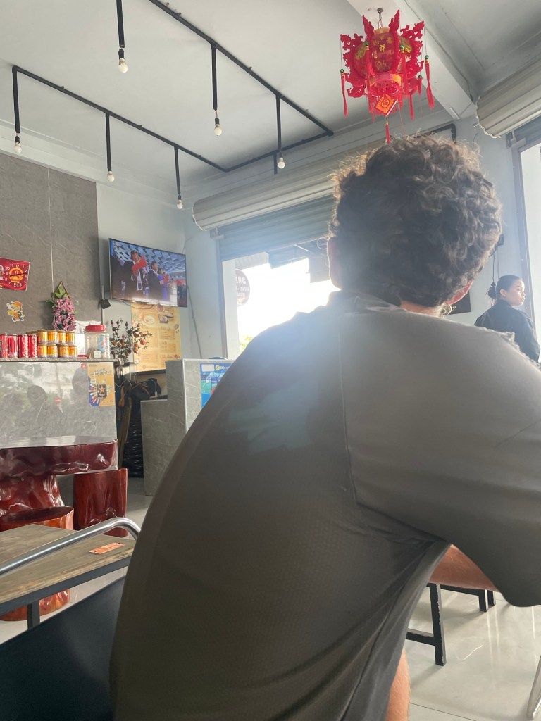 We didn’t rush our exit. We even joked about spending another night. The owners were lovely people and wished us well on our journey. A grand military parade was playing on their television. It was taking place in Ho Chi Minh to celebrate Reunification day. The 50th anniversary. We didn’t go more than a few hundred metres before we stopped for a coffee. The parade was playing here too. It was an important occasion for everyone.