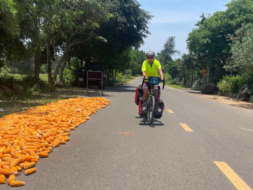 A surprisingly, and gratefully received, cold easterly wind was coming in off the sea. We’d been unduly nervous about the northerly headwind that plagues the eastern coast of Vietnam. After a brief section of urbanised seaside we were out in the countryside. Travelling through corn fields. The coastal road rose and fell. There was an incredible number of beautiful beaches. We were back in paradise.