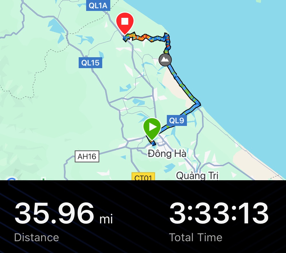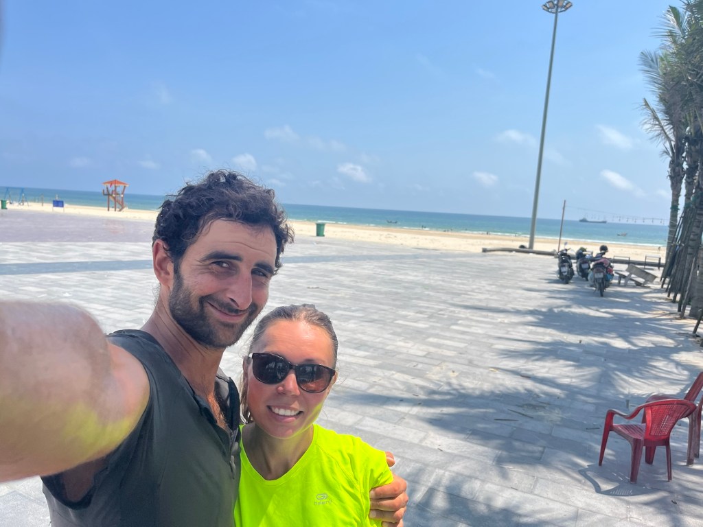 When we finally got going we were travelling past extensive rice paddies. Our goal was the coastline. That way we’d avoid the QL1. The major north-south coastal road. Four boys split between two electric scooters, rode up beside us. They said a friendly hello and asked us our names. They were very friendly. It wasn’t like Laos. We didn’t get the impression they were taking the piss. After a long 10 miles into the wind we reached the coastline. The first time since before Bangkok.