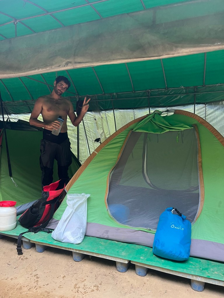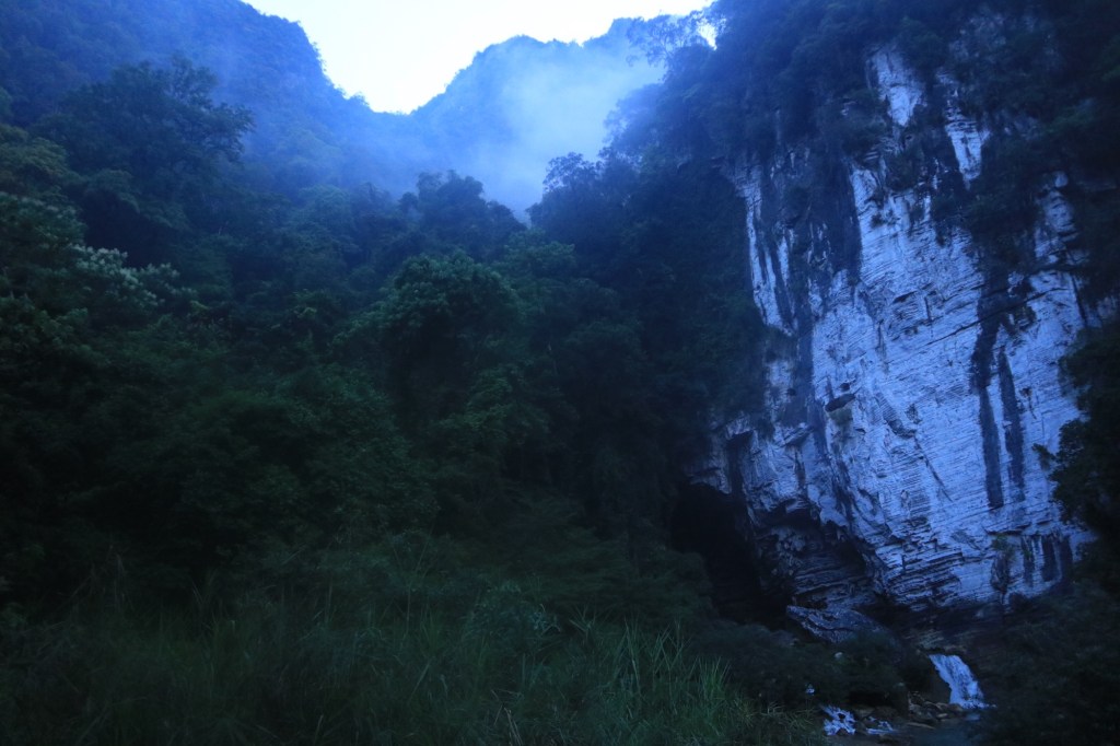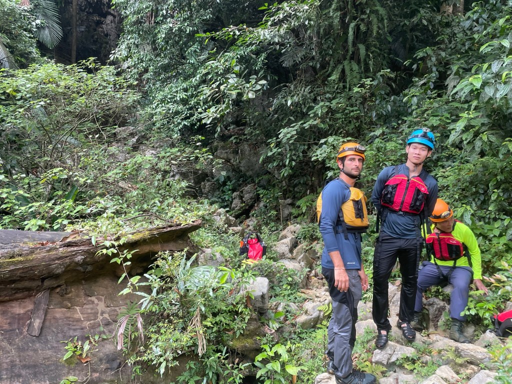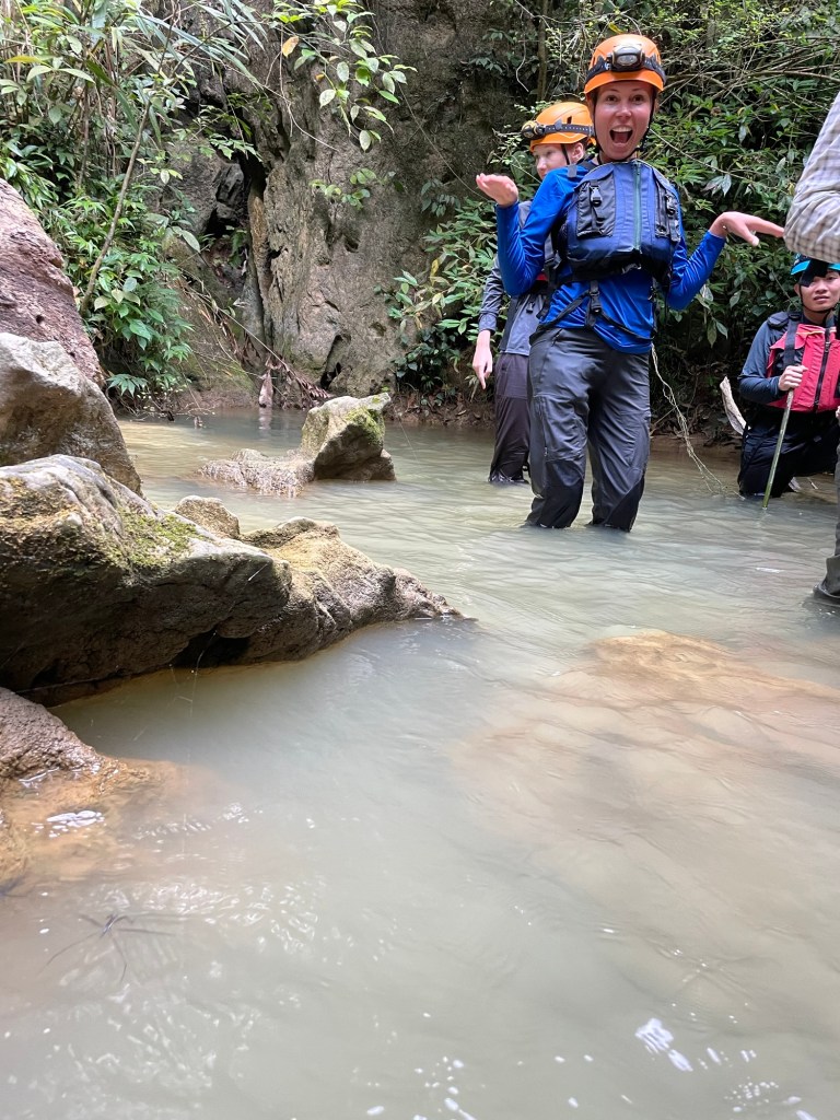 Breakfast was rice pancakes with bananas and a bowl of vermicelli noodles with tofu. We left the campsite without our PVC bag and went towards the cave above the waterfall next to the campsite. The rocks were a little slippy. The gaping opening housed a large pool of water. Entering the water fully clothed was odd. We swam 200m upstream, the ceiling of the cave revealed the complex combination of rocks. When we climbed out it was time for an ‘instagram’ photoshoot next to largest column in the Tu Lan system. Then we went on a higher pass to view the cave formations. It was fun to climb through the cave. Then we had another photoshoot.
