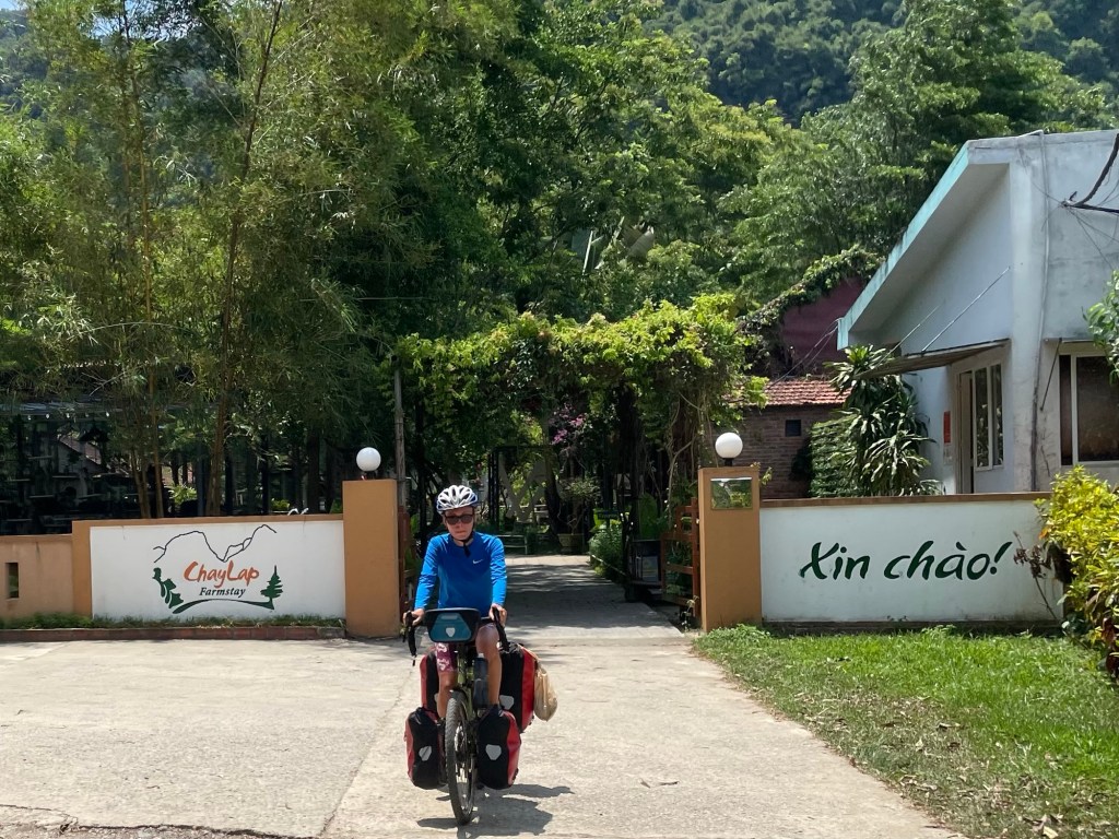 It soon ticked round to being time to pack up. We’d squabbled about how to deal with David the squatter for far too long. We packed our bikes and made to leave to a nearby hotel back towards Phong Nha. We’d have happily stayed at Chay Lap but the huge tour group that had booked it all out was just arriving. Jonathan’s tyre needed a bit of air and it was then we noticed the large split in Frankie’s rear tyre. Running along the rim bead. Damn. We’d been sure the Marathon Plus Tour tyres would last a while yet.