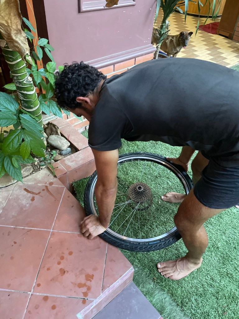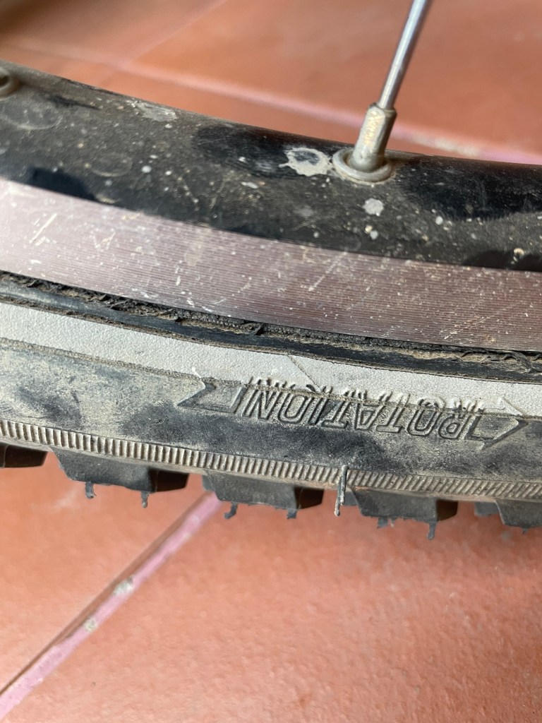 We’d heard from Schwalbe about the cause of the splitting tyre. It wasn’t seated properly. Anyone who’s tried to seat a Marathon Plus will know how hard it is. We set about trying to manipulate it further onto the rim. Lots of lubricating soap and extra high pressure inflation. It was nigh on impossible. According the Schwalbe the circumference tolerance of a rim is as high as 9.5mm. A larger rim makes it a struggle to get the tyre on. We did our best and think we improved both tyres. We’d have to replace the split one asap. We have one spare 26” with us but it’s a bit flimsy.
