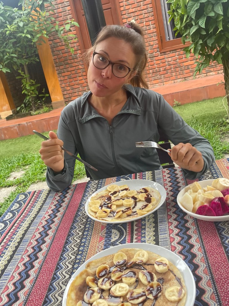 We deliberately aimed for a late start. Why not? It was lovely and cool. After we’d got most of our packing done we had yet another round of banana pancakes. These were the best yet. The chef had mastered the art of vegan pancakes. They came with a little bowl of mixed fruit. Some gunky Hershey’s chocolate sauce on top.