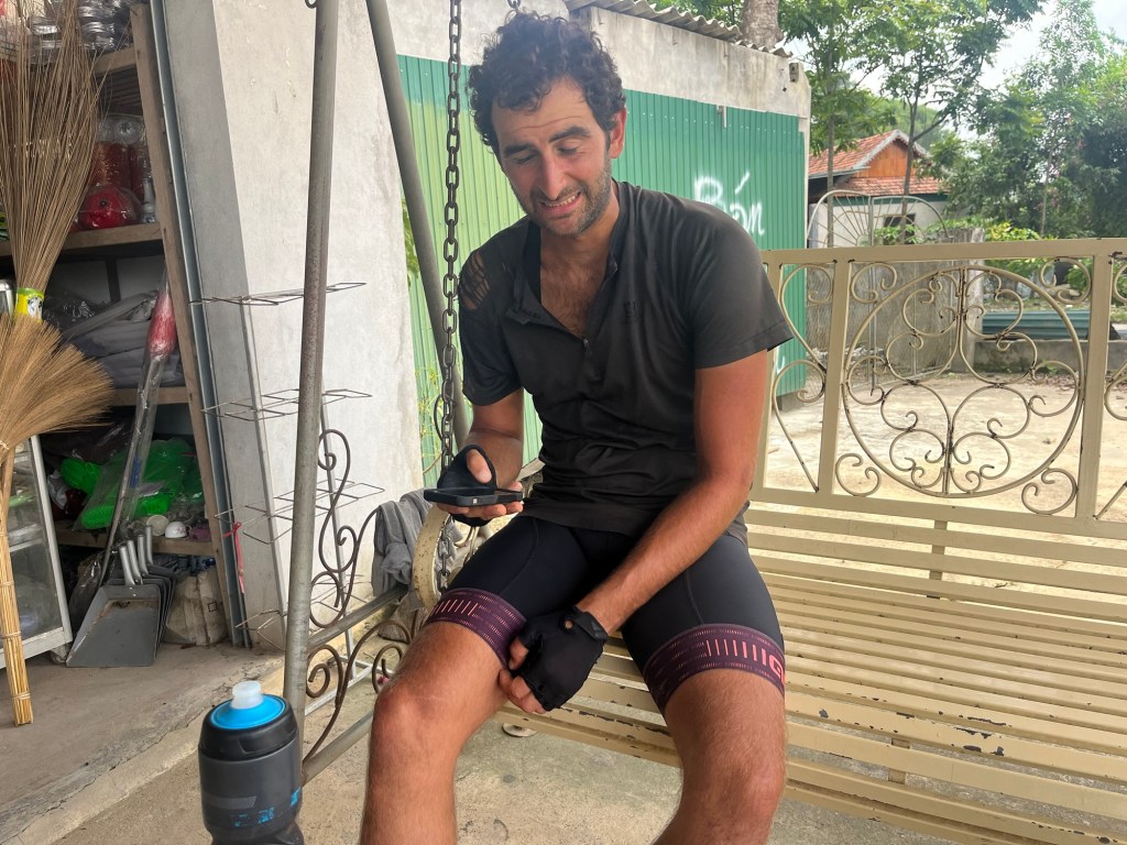 We’d decided to set off towards the Ho Chi Minh highway. We knew it would be hillier but quieter. This section looked interesting on the terrain map. The heat was coming early again. Sometimes there was very little air as we climbed. Jonathan had been noticing a pinging noise from his rear wheel on the climbs. It was definitely spoke related.
