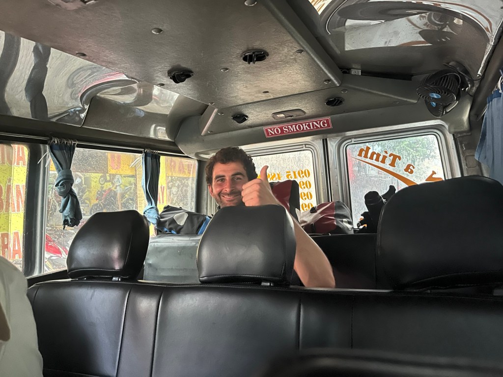 A minibus arrived. Already mostly full. Getting the bikes in looked ridiculously hard. But it was easy. Within a couple of minutes they were behind the rear seats. All the bags of mail and other goods you’d never expect on the bus were stashed somewhere else. Somehow. We slid into our seats. No seatbelts.