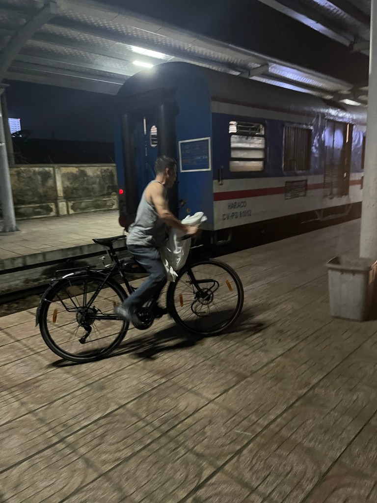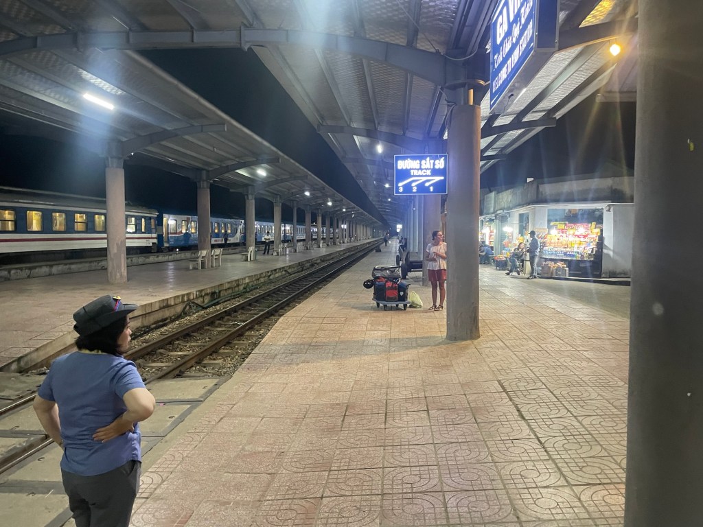 At 9pm, 40 minutes before the board said the train was due, a conductor came over and drove us into a state of panic. We should head to platform 3 for our train. We rushed out. With difficulty. Eight panniers, a top bag and a backpack. The train didn’t come. We stood on the platform looking at the NA2 train. Vietnam had some weird system of private train cars.