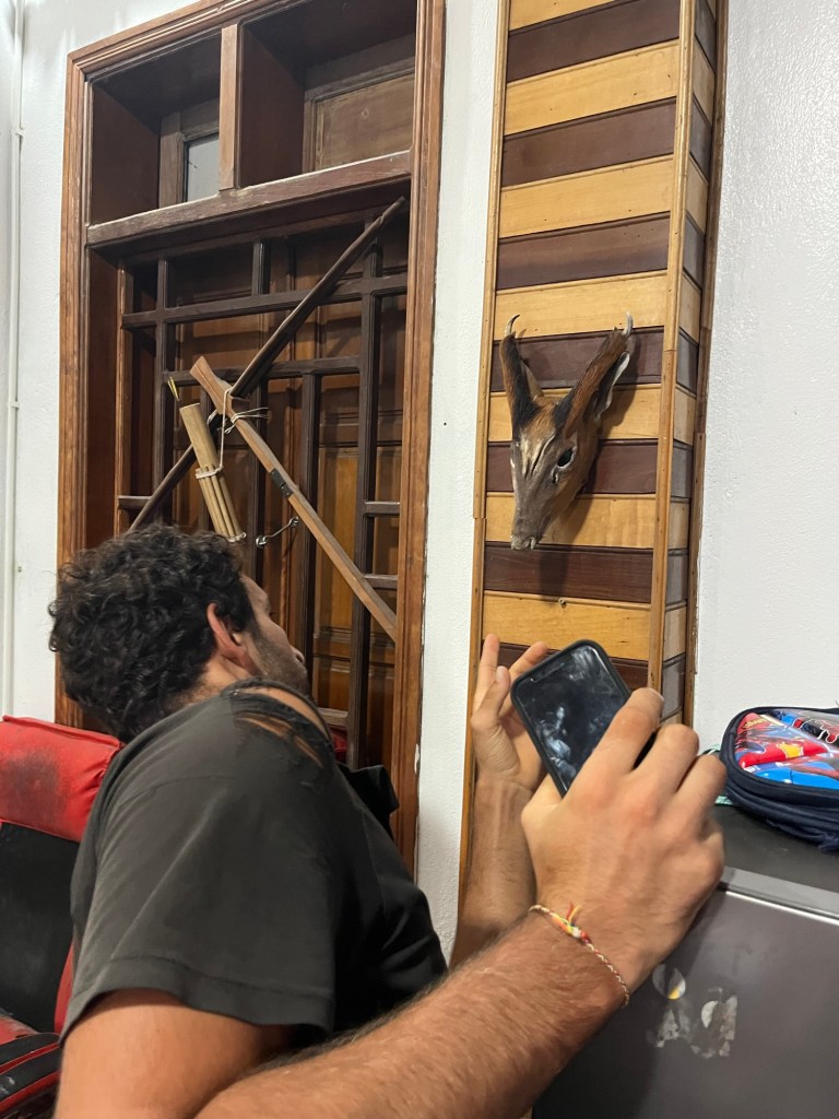 When we tried to leave in the morning we were blocked by rain. It started pouring just minutes before we finished packing the bikes. We stood around staring at it for almost an hour. Then we asked them for a coffee. While we were waiting we spotted what we thought might be a Saola head on their wall. Apparently the hunters in the area consider its rareness a badge of honour and refuse to stop. We asked, and they told us it was the head of a giant muntjac. We didn’t even know there was such a thing! We’d only seen petite ones in the UK.
