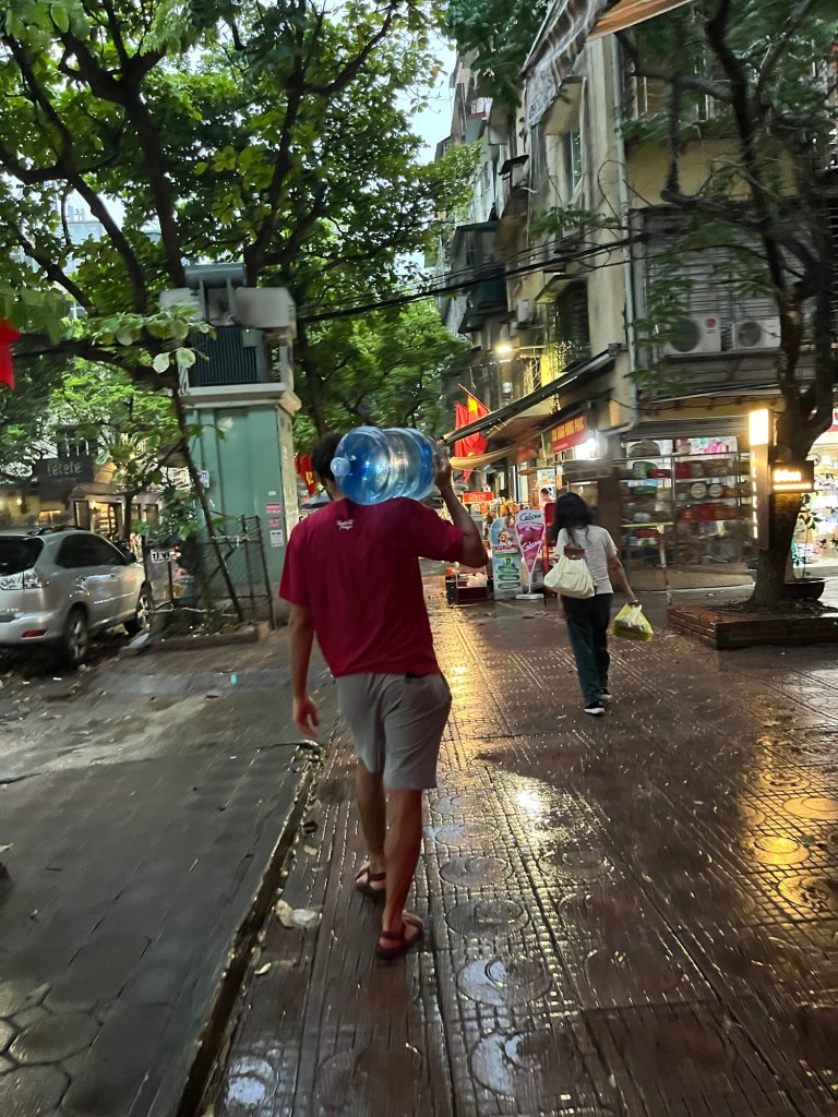 It had started to rain. We walked back. Bought some nuts on the way. Also papaya and dragonfruit. We asked about the huge tanks of water that are usually used for office water fountains. Some of them had a nozzle on the bottom. We discovered we could buy one for 120k then when we returned with the bottle next time, it would be 70k. Ideal. No more endless 5L plastic bottles.