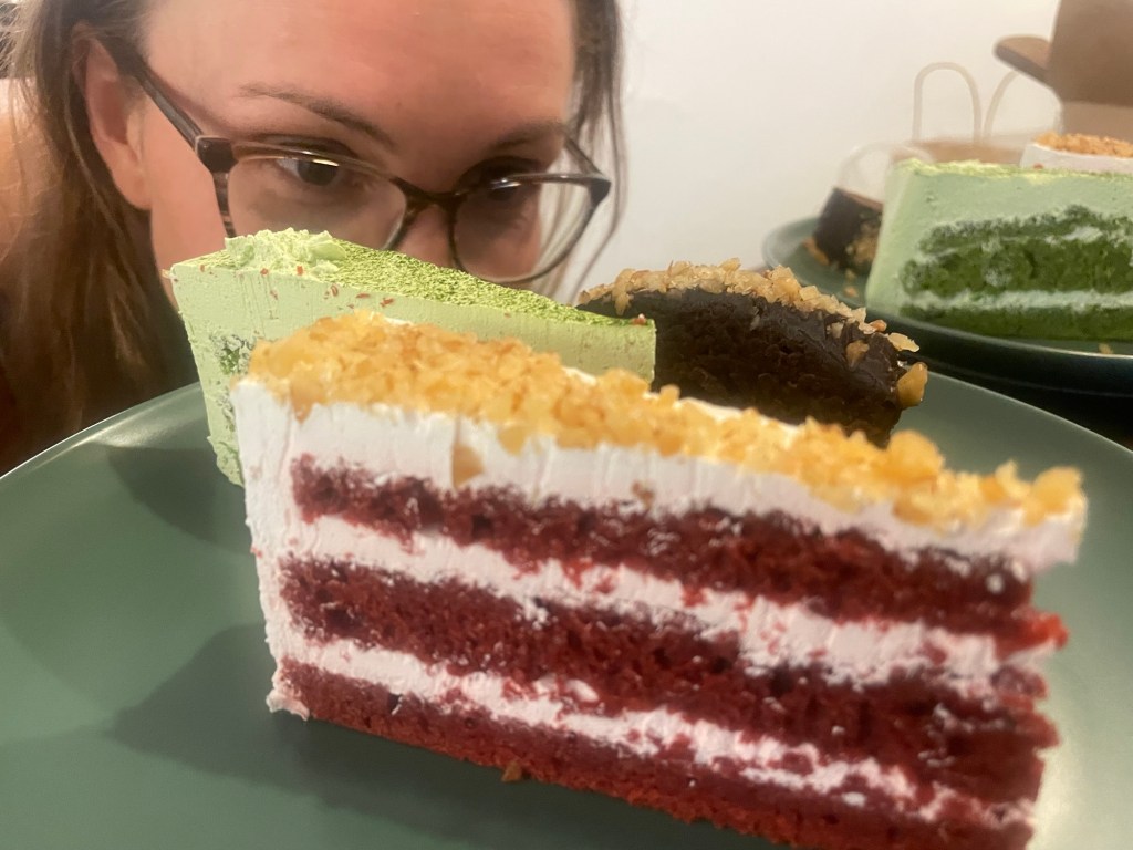 We had some vegan cake that we’d bought at iVegan earlier. There were three flavours, chocolate, matcha and red velvet. But they all tasted the same. Someone else had reviewed them saying they were tasteless too but we had to try them. A bit disappointing. Luckily we had plenty of fruit and nuts to peck