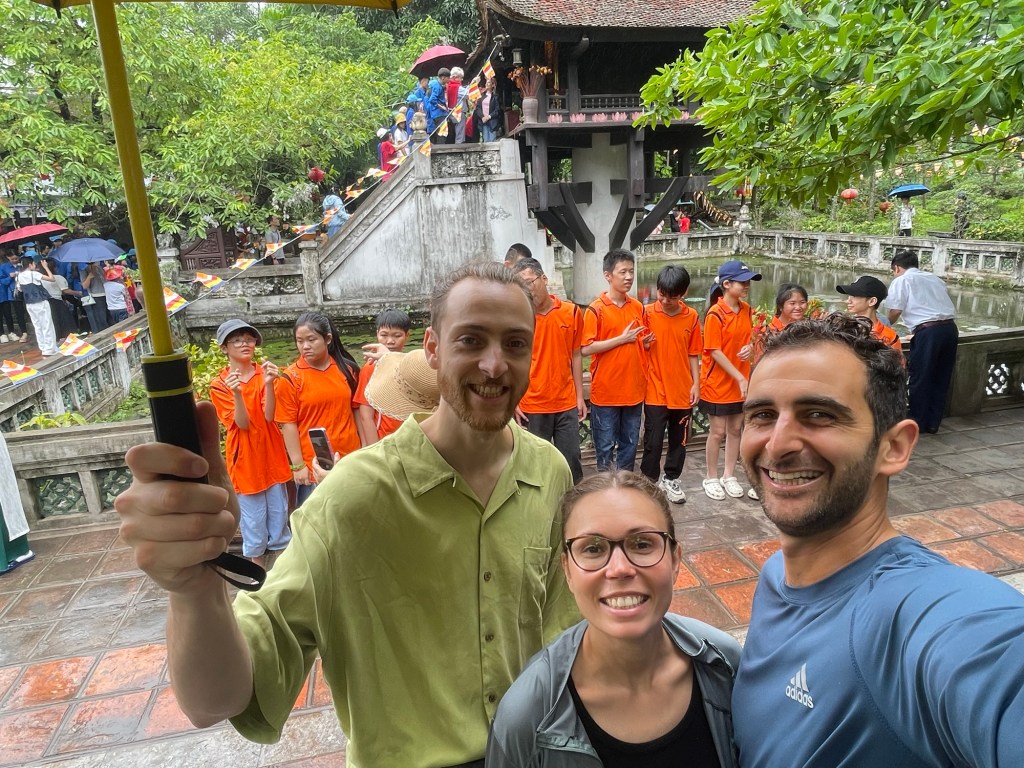After successfully seeing the body that Ho Chi Minh wanted to be cremated, we followed the people to his old stilt house. Except we weren’t allowed without a ticket, Vietnamese people were though. We refused to take part in their objective of making us different. It was such a cheap ticket there seemed to be no other purpose. Instead we headed to the One Pillar Pagoda. There we got into conversation with a group of students. An odd field trip. And we don’t just mean the fact it was a Sunday. They kept conferring, evidently trying to recall the different phrases they’d learnt in lessons. The usual questions about ourselves followed. It was a funny interaction. They were all very polite and respectful.