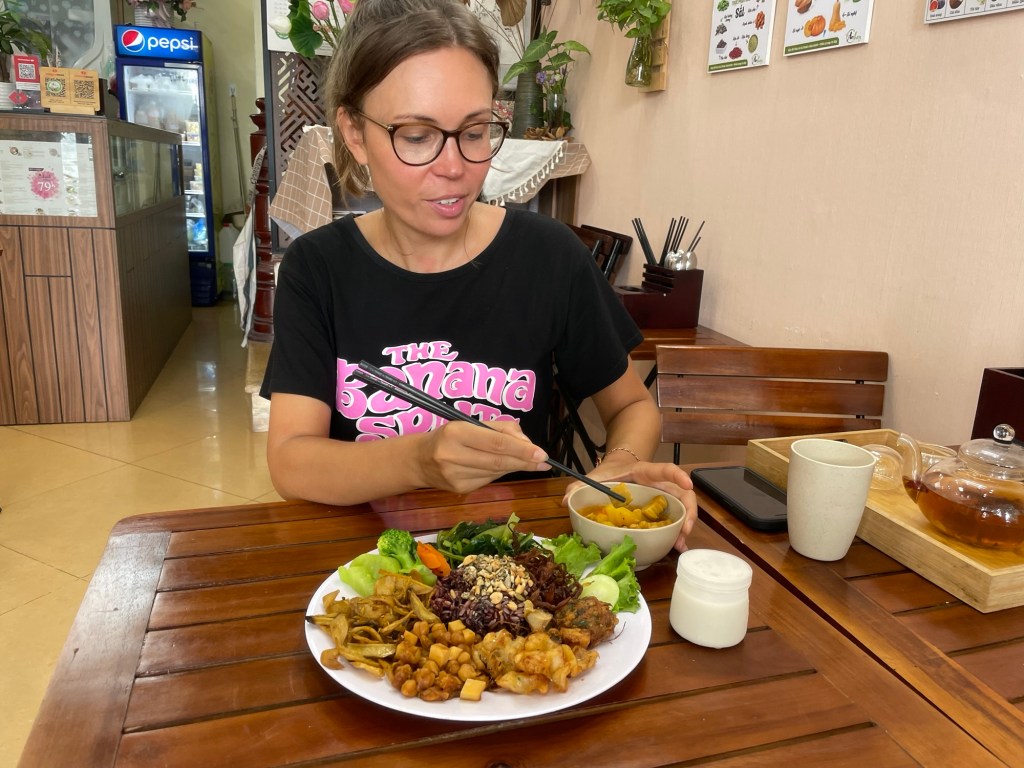 Not much further, on a little jut into the lake, we found a vegan restaurant called Chay An. It served affordable healthy dishes and they included nut milk and nut yoghurt. The latter was a little fizzy. We assumed it was supposed to be. We took the 146 bus home. They always have a driver and a conductor on the bus. It makes for timely services. The driver can immediately depart, rather than faffing around with tickets.