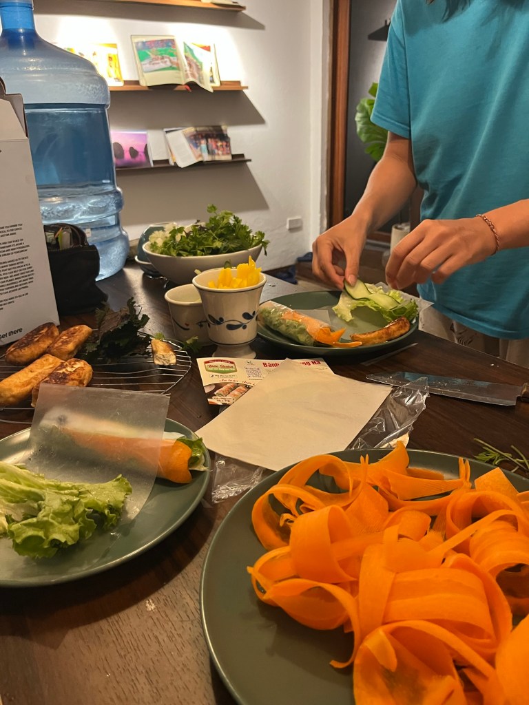 Frankie made a large bowl of fruit salad for us and we watched Your Friends and Neighbours. We nipped out for some tofu and vegetables. We were having fresh spring rolls again. For dessert Frankie made what she now called “stove top brownies.”