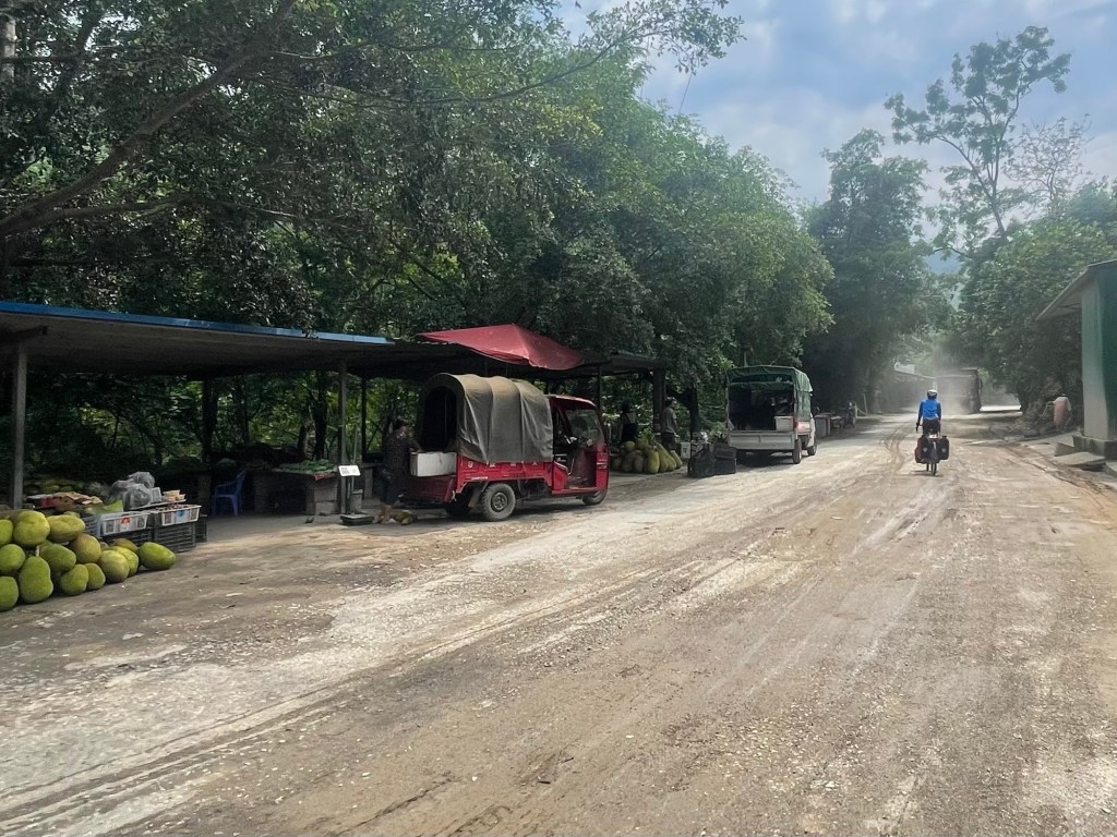 The road went through small village. It was almost always quiet and peaceful. We saw huge jackfruit for sale in one small town. We couldn’t help but wonder what the roads in the sky were for. The trucks just used the small roads like an expressway. They were destroyed in places. Deep potholes and rutted tarmac. Trucks barrelled past bearing familiar looking shipping containers on the back.