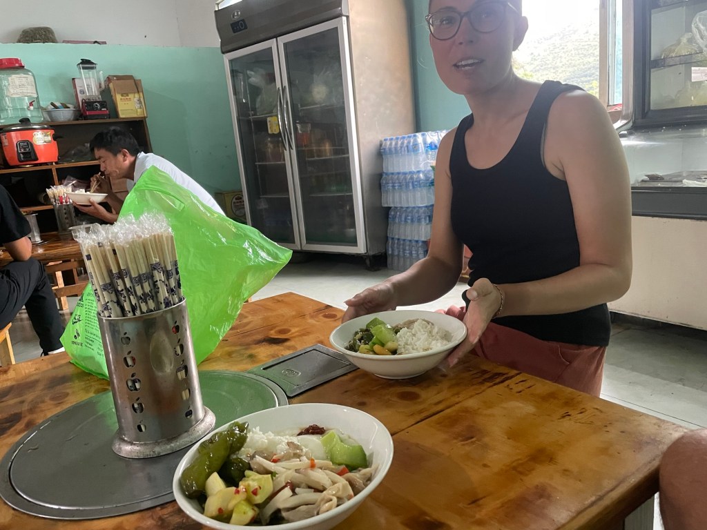 There was supposed to be a supermarket but it was closed. Instead we thought we’d try a restaurant again. As we peered into one, a woman beckoned us. We always like to be invited. When we translated to her that we “only eat plants”, she still seemed happy. Then pointed to some dishes in front her. It was a buffet. There were plenty of vegetables here. A big dish of soft tofu. An enormous bucket of rice. We could return as much as we liked. There were some tasty chilli edamame beans and delicious mushrooms. Chewy but soft. We went back a few times.