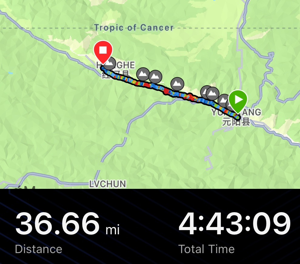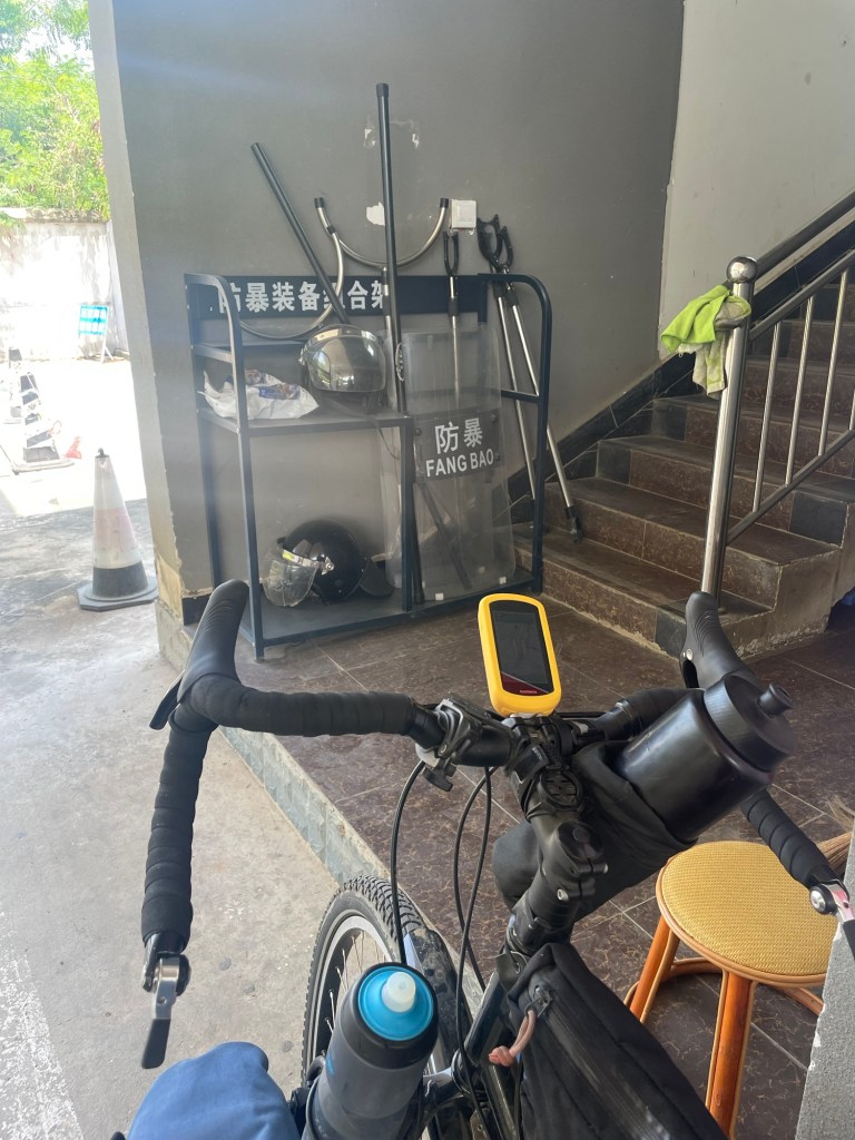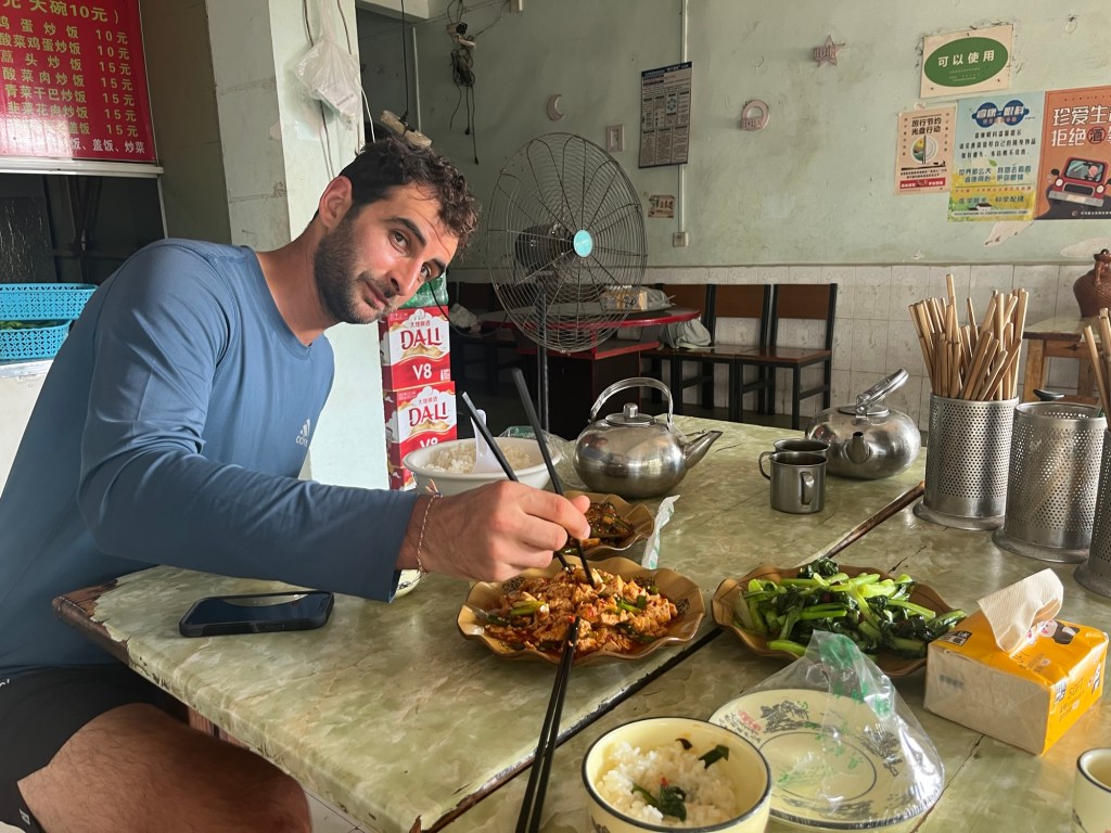 We suddenly appeared at a roundabout. Surrounded by shops, restaurants and watchful eyes. We never knew what to expect looking at our map. We’d incorrectly assumed it would be quiet as the main town of Honghe was another 150m up behind us. We stopped at a shop and glugged some cold water, simultaneously snacking on a pack of seasoned tofu slivers.