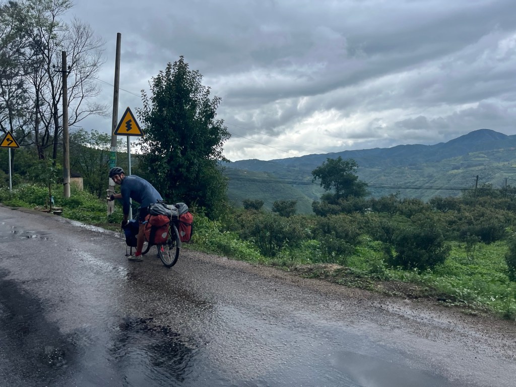 Xincheng marked the start of the days efforts. After drinking some kind of energy drink we picked up our climb. We were going to rise 600m over the next 13km. It began rather steeply. After half an hour it started to rain. It was still warm, 27C. Looking back to the valley we’d ridden down we could see dark clouds forming. Thunder rumbled in the distance. Anxiety about being caught in a storm kicked in. There was no choice but to push relentlessly on.