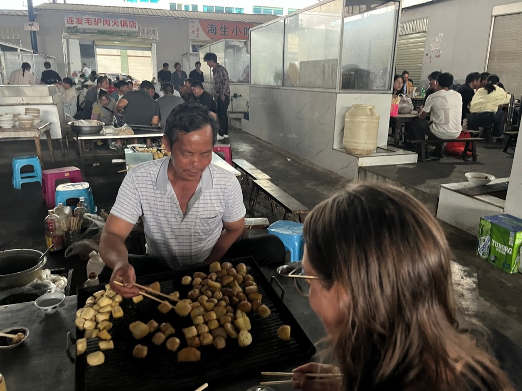 Wandering down an alley led us to an even larger market. It was remarkably extensive. We decided to sit at a tofu bar. A drunk guy was manning the grill. He counted our food with pieces of dried corn as we fished it off the heat. He kept offering us a clear alcohol. Now we understood what they were about. It turned out to be very expensive for the amount of food we had. Some more drunk guys came over and took photos with Jonathan. Everyone had been watching us while we sat there.