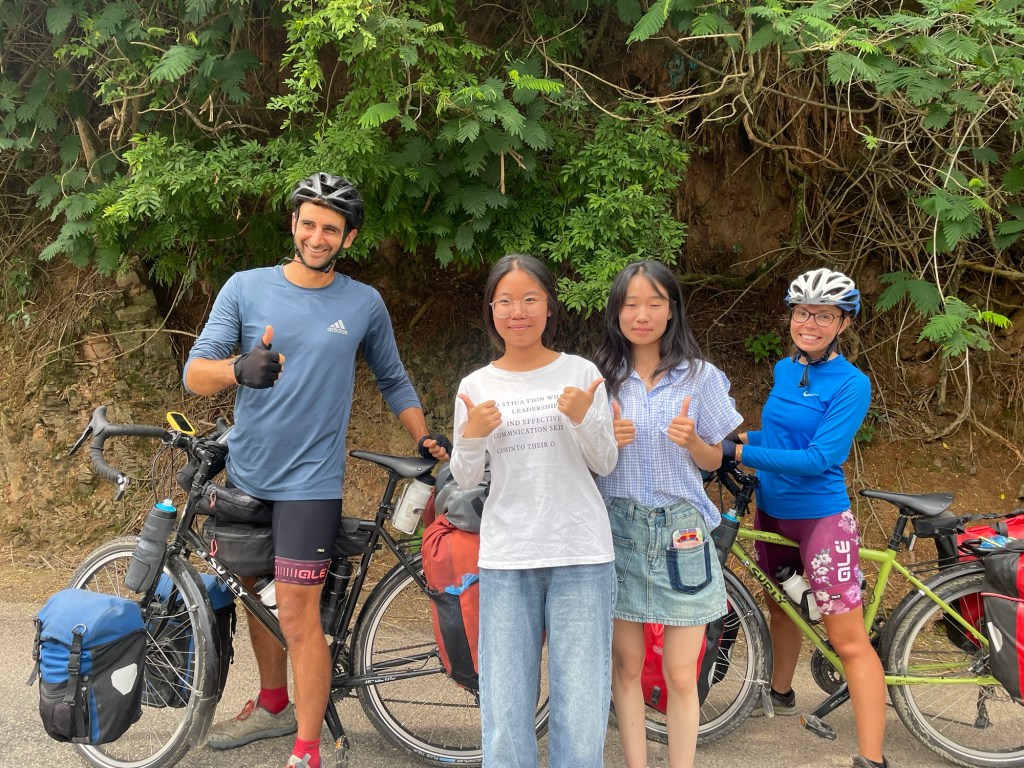 The road dropped 200m through a gorgeous valley. The steep tree covered sides flanking the small amount of flat land where farming was able to take place. Rushing through cool air in a spectacular, lush green environment it didn’t take long to hit the bottom. We started gradually going back up. A small white electric car my stopped ahead of us. A young girl got out and chased Jonathan up the road. They wanted to take photos with us! It was very sweet. We’d found Chinese people to be very reserved. Except young people who were after a photo. We of course obliged.