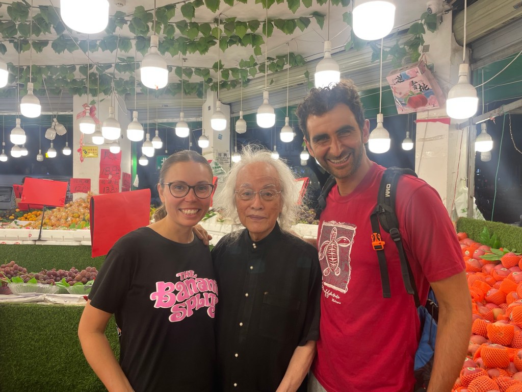 There was no toilet in the restaurant. However, China has an abundance of public toilets. A phenomenal amount so there is always one nearby. When Frankie went to the toilet, a group of Chinese men engaged Jonathan in conversation. Immediately an invitation to smoke was extended. They were very friendly. We bought some fruit from a large shop. A man came over. Jolly Koh was an 84 year old artist from Malaysia. He’d been to Dali to unveil his latest piece of work. Angela, his wife, was much younger than he.