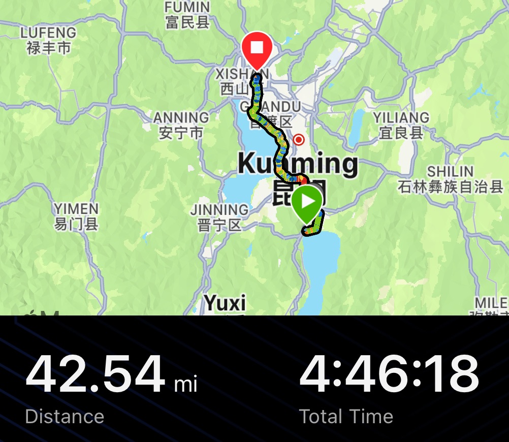 Not more than a 100m lower down and we entered a new plateau. Glimpses of a large lake appeared in the distance. Nearby it was mainly industrial buildings. Gradually we descended down to a huge array of apartment blocks. Despite feeling like we were close to Kunming, it was another 40km.
