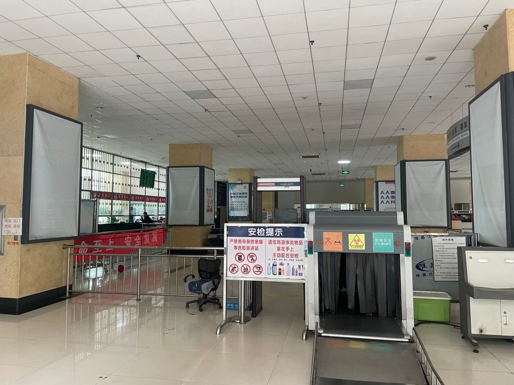 The forecast for the day was the least wet we could hope for. After a relaxing morning we hurriedly got ready and made for Kunming East Bus Station. Line 5 from the nearby station, Huashan West Road. The station was clean and quiet. WeChat didn’t let us buy tickets. Some payments just don’t work. Usually the combined payment QR codes that allow use of Alipay as well, fail. Fortunately we had cash. It cost ¥4 or 40p each. A stiff ticket card was issued and as well as the overtly placed security cameras, there was also a metal detector and x-ray machine to pass through.