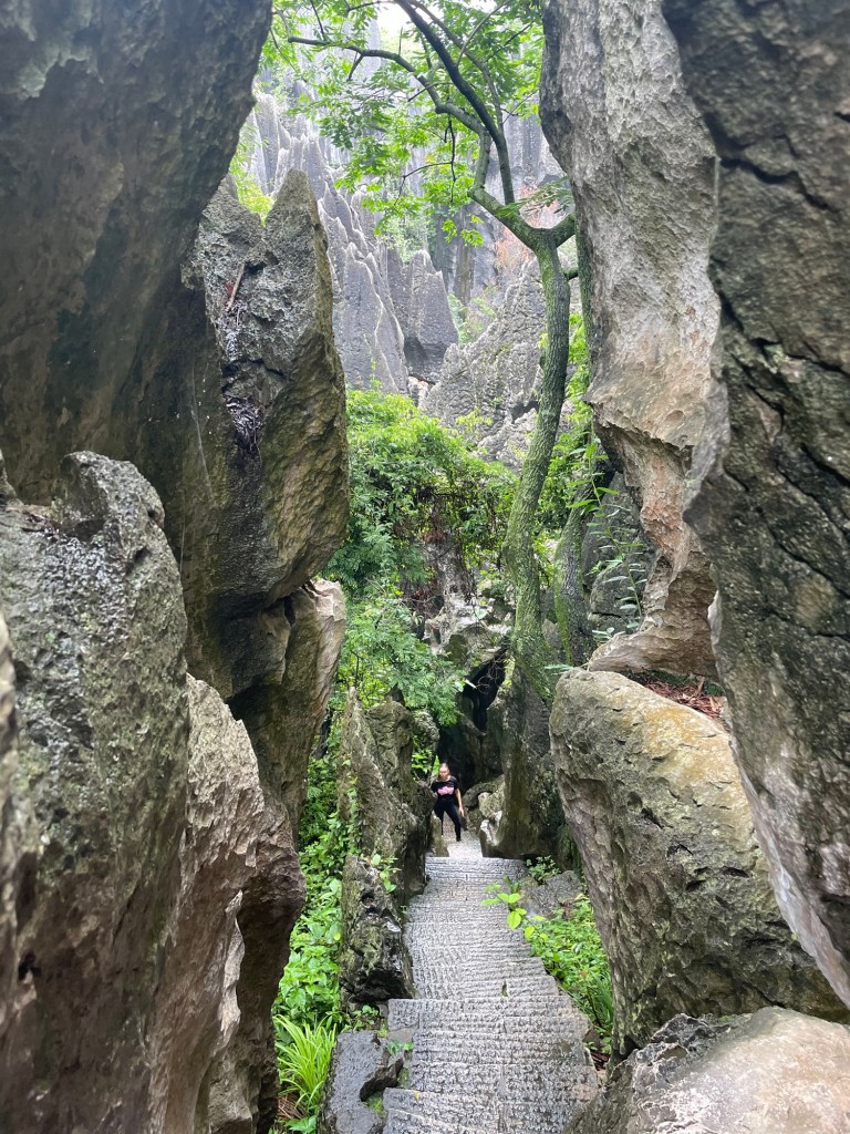 Following the signs to Peak View Pavilion we hoped to see the karst from above. Unsurprisingly, everyone had the same thought and it was excessively noisy. Tour guides were shouting into their microphones that deafened us with their speakers. Everyone was trying to get an ‘instagram shot’. Escaping from the pavilion we found our way into a beautiful gorge. The steep path was probably putting people off. Up and down many steep stairs we went. Soon there was only murmurings of the crowds and we were buried in, jungle cloaked, towering karst. We had found a Stone Forest.