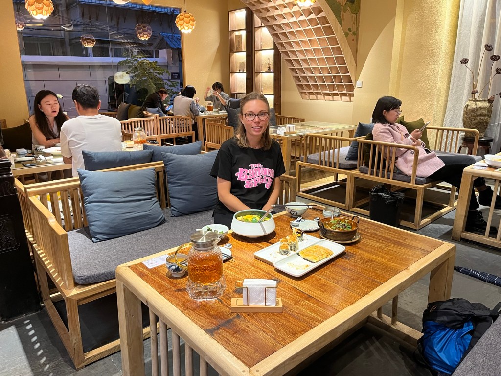 We perused for a while but it was almost 7pm so we went for dinner at Juezhengjing, a vegetarian restaurant. Comfortable and fancy, everything was vegan but the pizza. Ordering through the WeChat app actually worked this time. We ordered a spicy noodle dish, tofu and pickles, something that looked like sushi and accidentally ordered a potato dish we thought was tofu. It was expensive by our standards, £11. We felt like normal tourists, eating out till late, then walked back in the light rain. We felt thankful not to be leaving the next day. We finished off our pile of bakery treats and watched another episode of Forever.