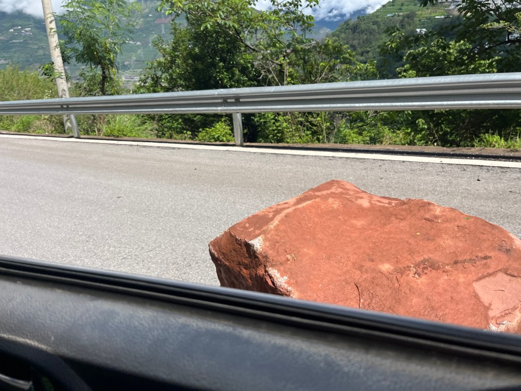 After an hour or so we set off back to the town. We stopped at a small market to buy some small green plums and small yellow bananas on the way. As we set off back down the landslide covered road we not only found that many of the smaller rocks had been swept away by diligent drivers. We also discovered several enormous boulders in the middle of the road. They’d fallen in between our journey up and down. One of them had crushed the safety barrier. We could only imagine the impact on the roof of the car. Or worse, on us while cycling. The effect of the summer rains was quite something.