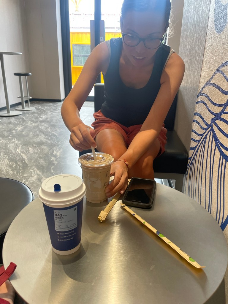 We walked to a Luckin coffee shop. A coffee chain that was successfully attempting to unseat Starbucks. It was far cheaper. We struggled to order drinks using the WeChat miniapp. After coaxing the carton of coconut milk from the baristas we ascertained it was vegan. They duly wiped it down before replacing it in the fridge. Frankie had an iced coconut latte. Jonathan stuck to his plain black americano.